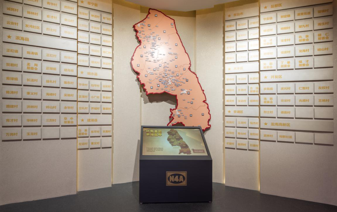 鹽城新四軍紀(jì)念館是全國唯一的專業(yè)性新四軍紀(jì)念館。醒目的藍(lán)白相間的“N4A”臂章圖案,鑲嵌在展廳正門上方,兩側(cè)旗形的花崗石陰雕畫,藝術(shù)地再現(xiàn)了新四軍與八路軍在白駒獅子口勝利會師和皖南事變后新四軍在鹽城重建軍部的歷史場面。
