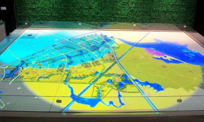 立體數字沙盤又稱為立體電子沙盤,是屏幕+實體沙盤模型+燈光+語音解說的結合體。屏幕中的內容是利用三維動畫技術所制作而成再利用投影機投射到屏幕中,想宣傳片樣,再結合實體沙盤模型共同展現。在屏幕中的三維內容展現時,實體沙盤模型利用燈光效果來回應所展現的內容,與它融合在起。立體數字沙盤有兩種方法實現互動功能,是利用觸控體機來實現;二是在實體沙盤模型中安裝感應設備,用激光筆來點擊沙盤實體互動。