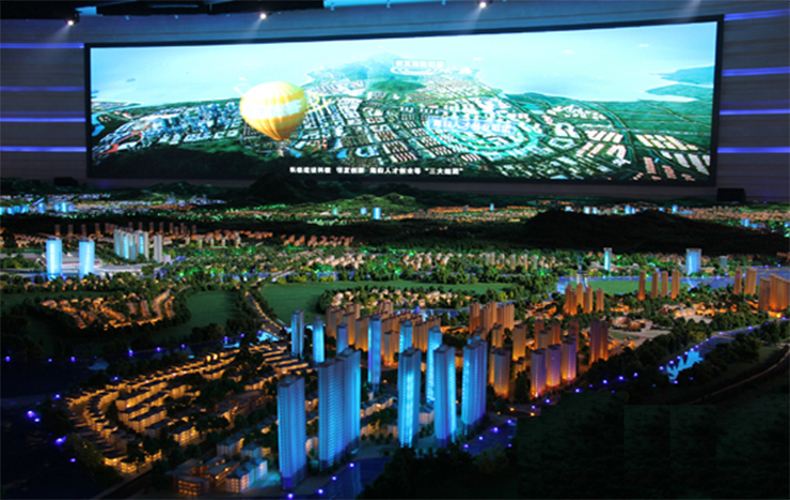 首先將城市的所有(建筑、交通、環(huán)境)制作成三維動(dòng)畫(huà)內(nèi)容;其次用制作好的沙盤(pán)模型展示城市的風(fēng)貌,然后利用投影機(jī)將三維動(dòng)畫(huà)內(nèi)容投射到屏幕上,大屏幕在播放的同時(shí),實(shí)體沙盤(pán)模型也會(huì)同步配合展示,呈現(xiàn)出震撼的視覺(jué)效果。
