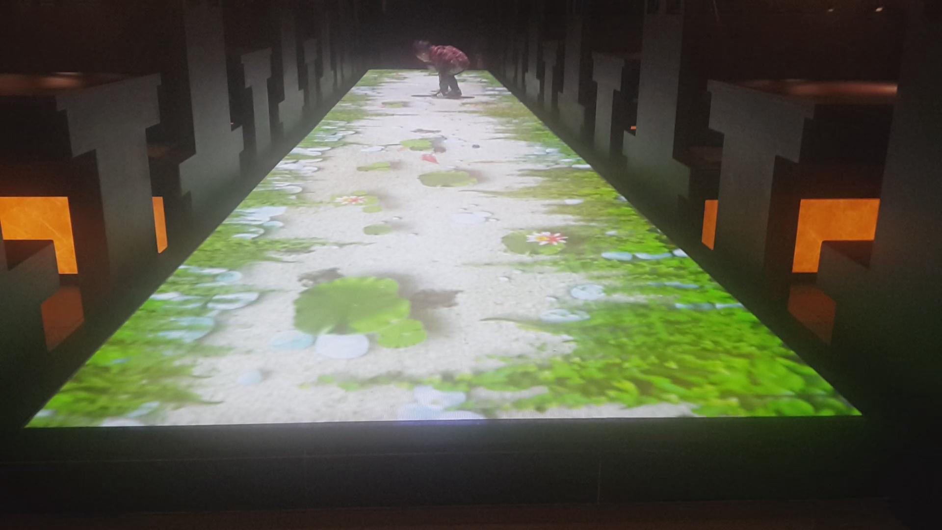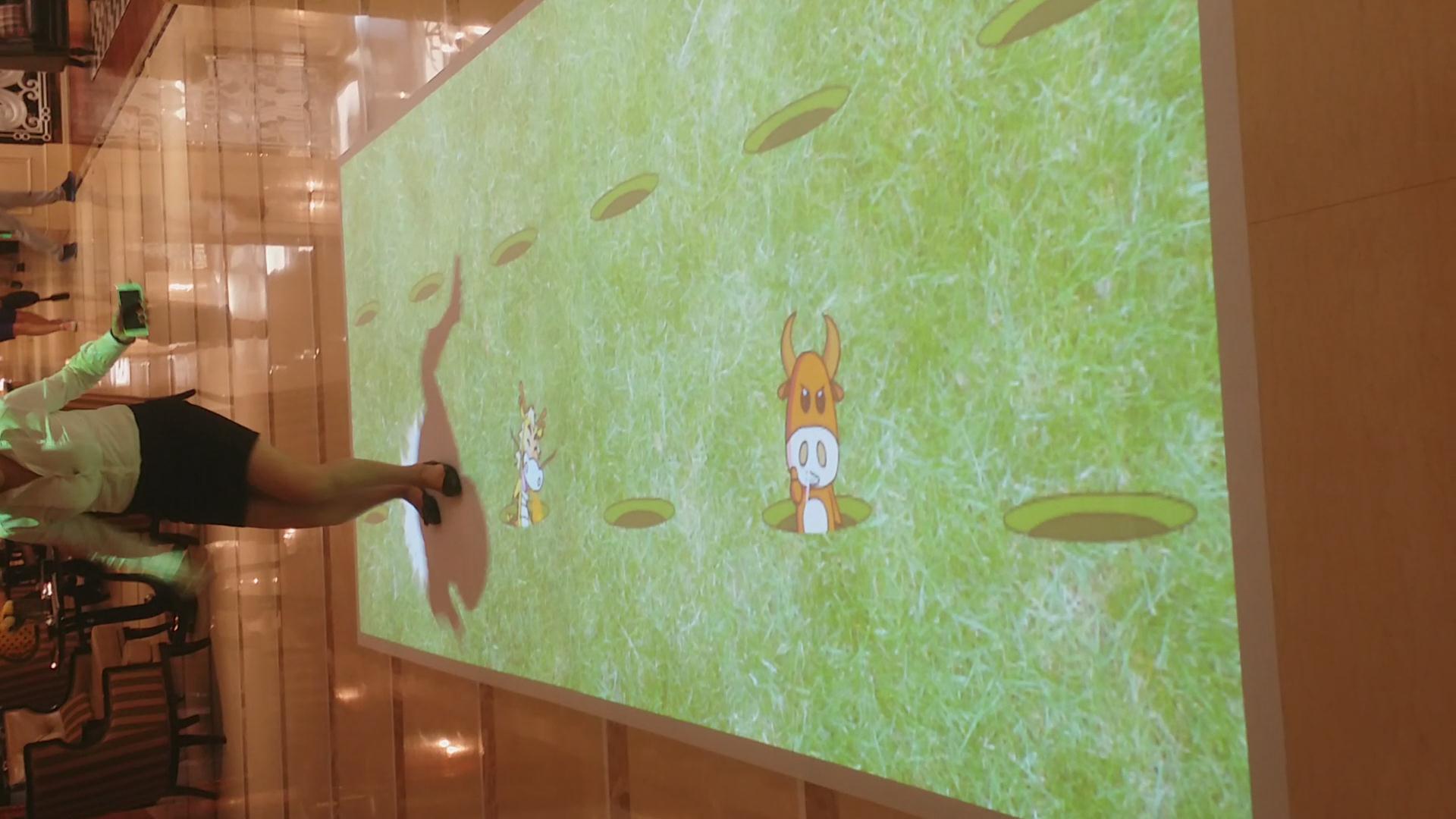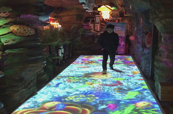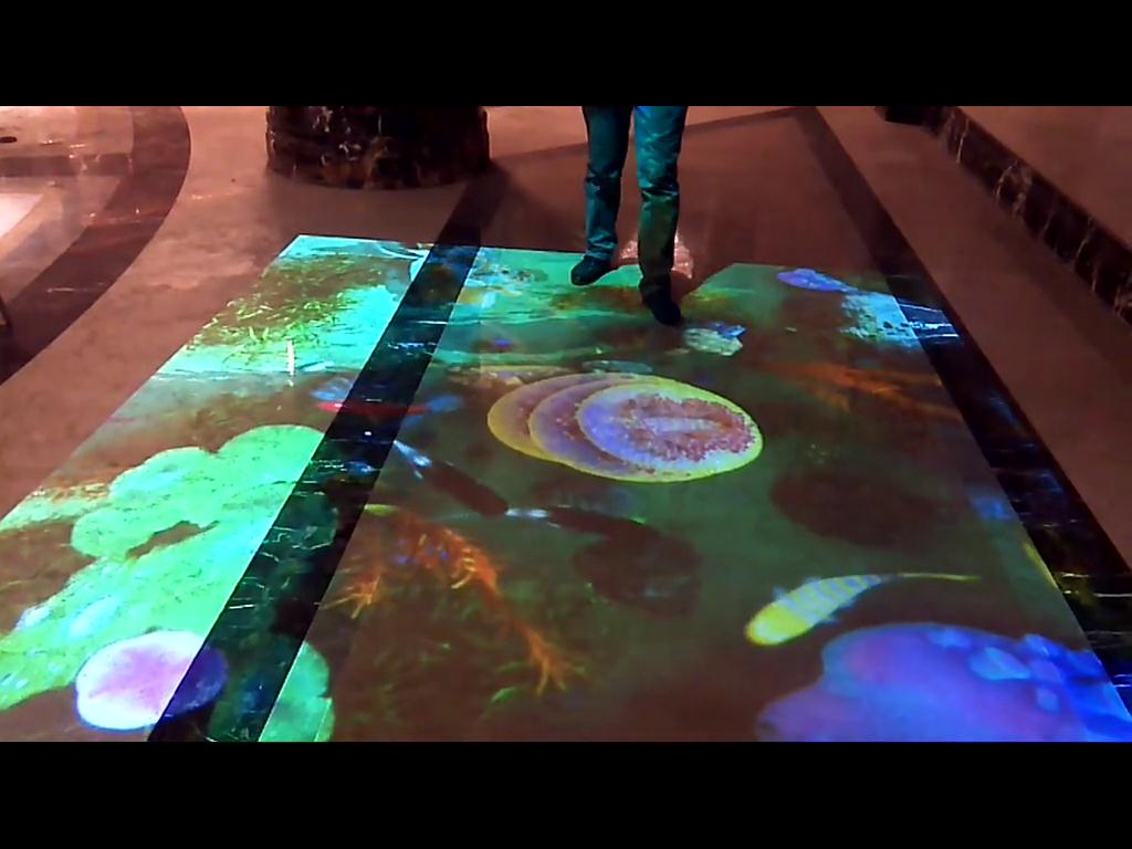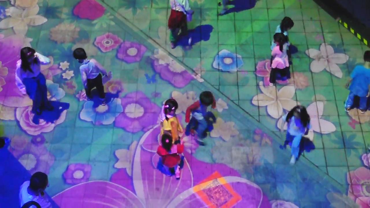 地面投影,又稱為“地面互動投影”,系統由互動軟件及感應設備組成,通過投影機投身在地面,人與感應設備觸發軟件產生的特定動畫效果。價格方面,是由軟件及硬件設計得來,軟件一般約2-10萬,硬件則根據實際使用量來定區間約3-20萬,其中投影機的數量是根據占地面積來決定的。火米目前有兩種地面互動一種是地面投影互動,一種是地磚屏互動